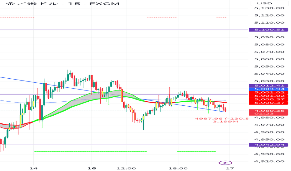 現在の価格(約4,993ドル付近)は、心理的かつテクニカルな重要節目である5,000ドルの直下で推移しており、上値を抑えられています。短期足(5分〜1時間)のGMMA(リボン状のインジケーター)が赤色(下降トレンド)を示しており、戻り売りの圧力が強い状態です。