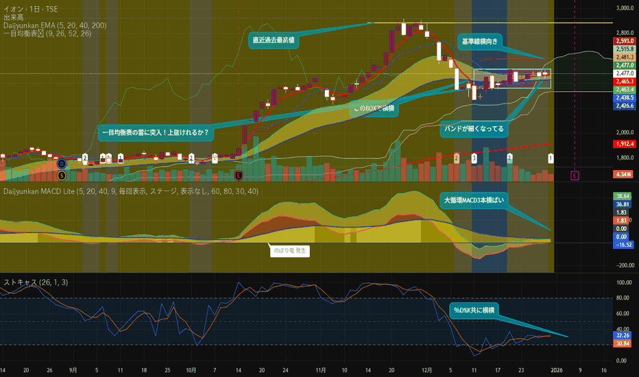 価格はEMA09付近で推移しており、短期トレンドは不
