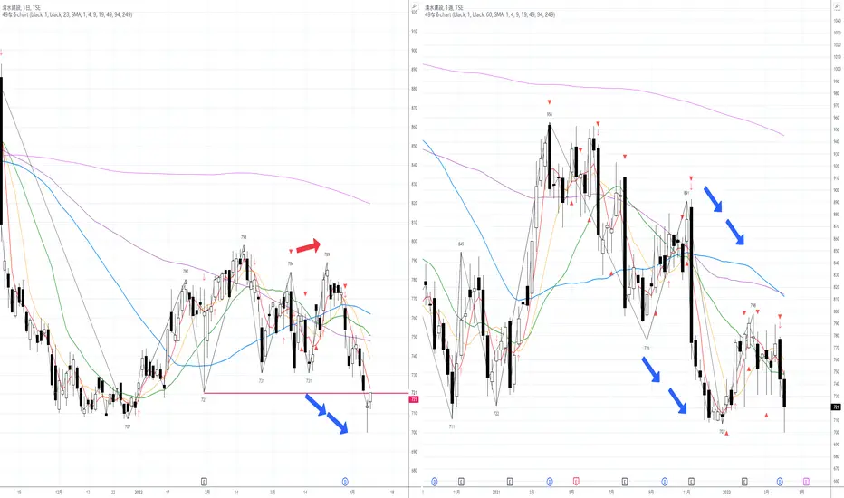 2つ前のより安い安値721円を割っているので実質下降トレンド。