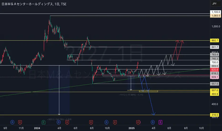 緑色トレンドラインで下げ止まりを見せて625.8円がサポートされると直近で700円に向かうイメージ。