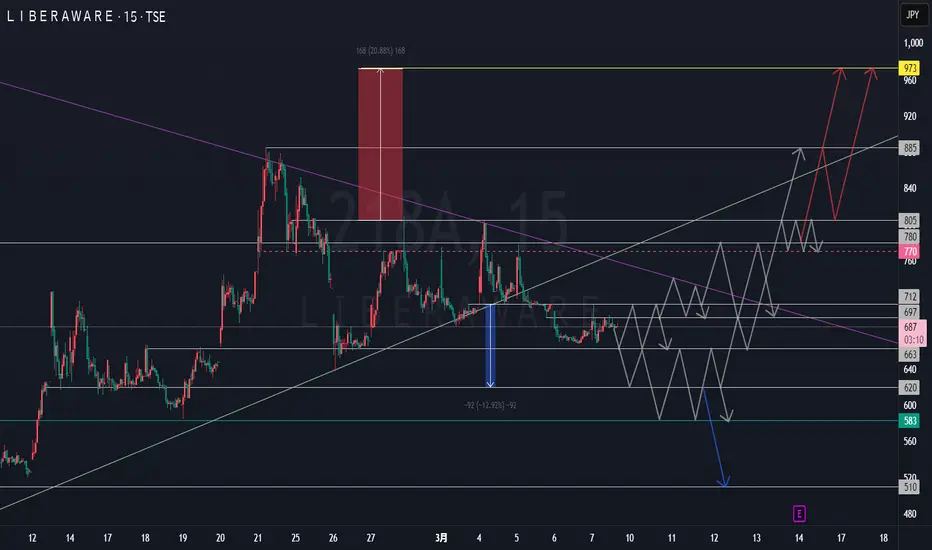 逆に紫トレンドラインを上抜け712円がサポートされると直近高値に向かって上昇できる可能性があります。その際、770円がサポートされると安心です。