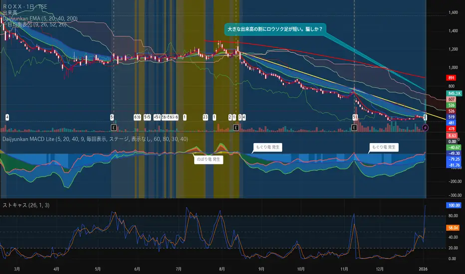 このチャート、凄い出来高があるのにロウソク足が短い。逆に全然出来高がないのに長いロウソク足が出てる銘柄は騙しの可能性が高いので後日様子見。