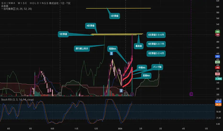 123を起点として上昇目途を計算しましたがE計算値だけが高かったのでVとNは普通に超えて来ると思います。E計算値の値を一旦の上限値として注目しておいて下さい。