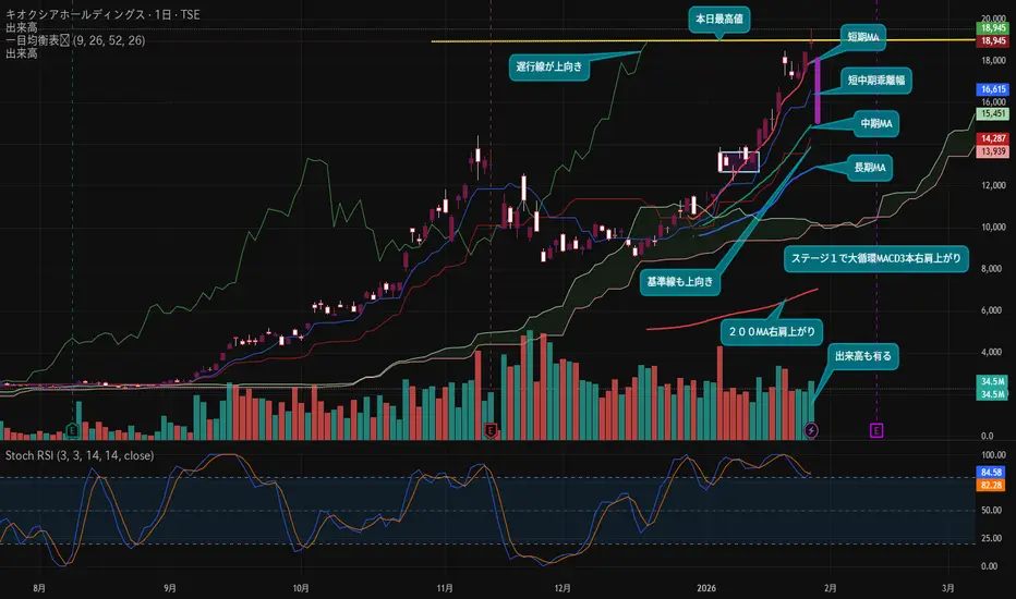 赤い短期MAた調整の為に中期MAに近づいて来てもその時緑の中期MAが右肩上がりなら短期MAは下抜けられないので反発して再び上昇となります。ここでは表示出来ませんが大循環EMAは買いを示唆するステージ1、大循環MACD3本右肩上がりで一目均衡表の一番大切な基準線と遅行線が上向き、出来高もそこそこあって200MA右肩上がり^^v