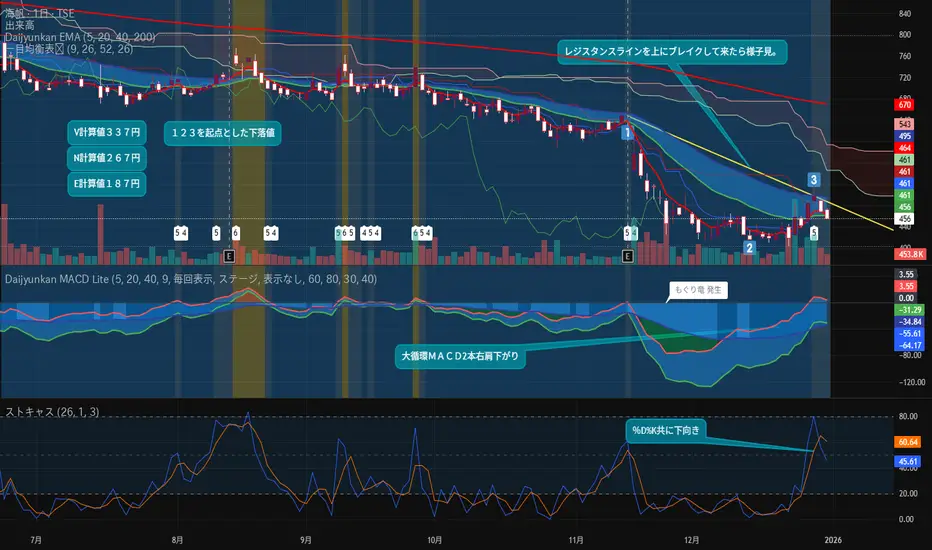 ポイントは短期MAが中期MAに入って来てるという事。もし先で出来高を伴った陽線で長期MAおも上抜けて来たら新たな展開になりそうだが現状は中立。
