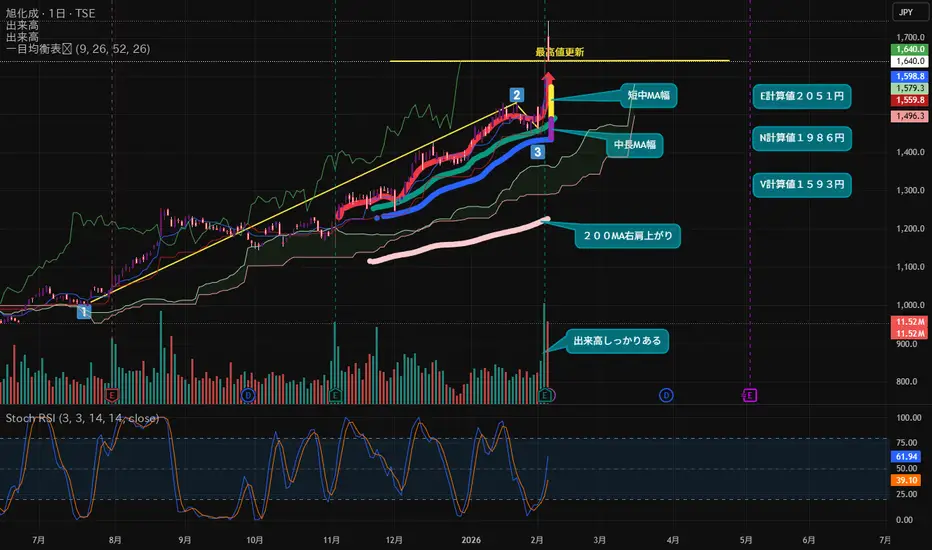 本日陰線で高値更新の旭化成さん、従来の予想から50億円の上方修正が入り上昇!!前日から少し跳ねた感があるので後日より数日調整が入る可能性が有りますがその後は上昇の兆し。大循環EMAステージ1で中長期バンド幅もそこそこあって上昇中!週足でチャートを見てもかなり上昇の力が強い感じがします。123の起点での各計算はPOPのとうりです。