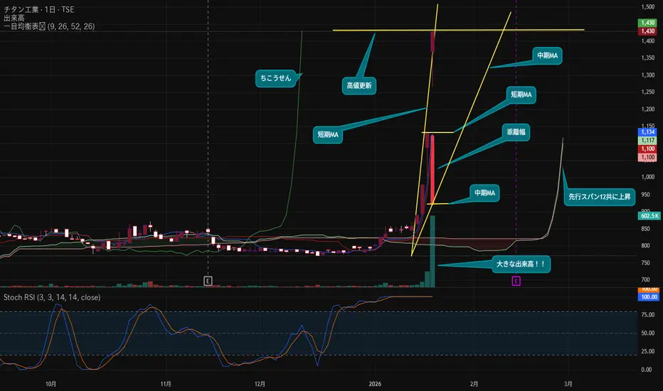 ここでは出せていませんが大循環EMAステージ1で窓開けの上昇一目均衡表の抵抗帯の雲にロウソク足があり遅行線上向き転換線、基準線上向き!本日高値更新大きな出来高を伴って長い陽線で上昇!!だけど!!跳ねた急激な上昇は必ず跳ねた分の陰線を付けて本来の時価総額に戻って来ます。本当に跳ねただけの事業実績が有ったのか後日から要観察です。