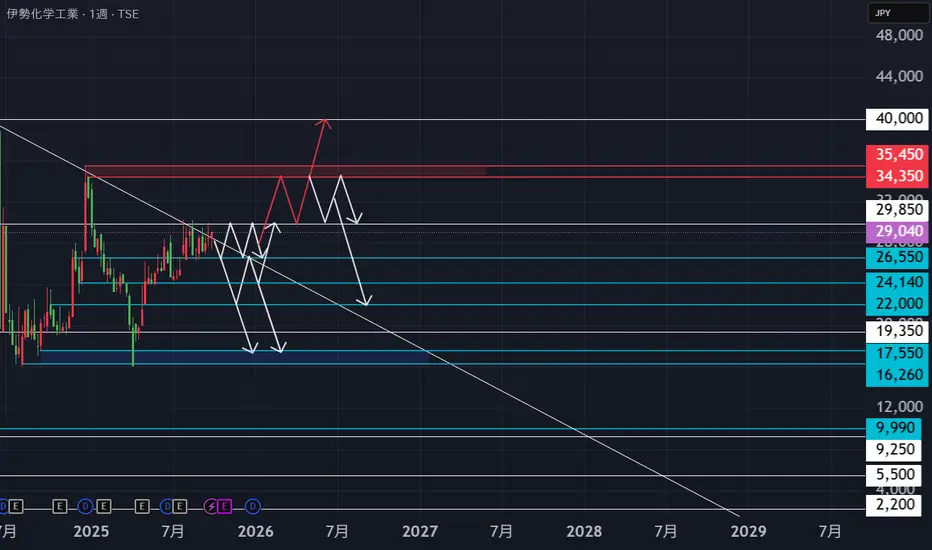 週足 29850ラインを週足の終値で抜けてサポートされて赤いゾーンを超えてくれば40000近くまで爆上げする