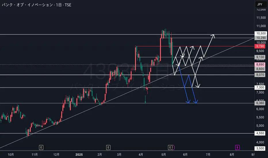 8070円までは上目線、下抜けし7300円を試し戻りが弱い状況だと6360円付近に向かって下降するイメージです。