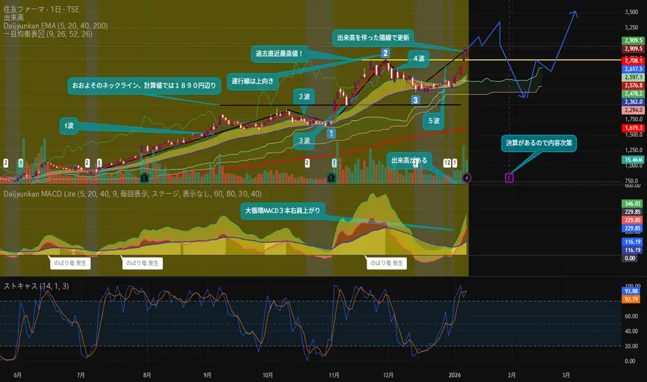 一目均衡表では上昇5波下降3波が基準の波動になっていて今のチャートを上昇5波目だと見ると今後の上昇が終わったら下降3波で調整が入る動きになります。パターンとしては下降3波は高値の2/3辺りまで下降するので今日の株価で行くと1890円位まで下がってくる可能性を考慮来て予後観察となります。123を起点とした上値目途ではE計算値3792円N計算値3295円V計算値3232円となります。住友ファーマは出来高も有るし一目均衡表の三役好転出もあるので今後下降3波の調整が入っても保有してる方はOUTPUTせずにそのまま持ち続けると再び上昇トレンドになると思います。(私個人の分析なのであくまで参考までに!^^v)