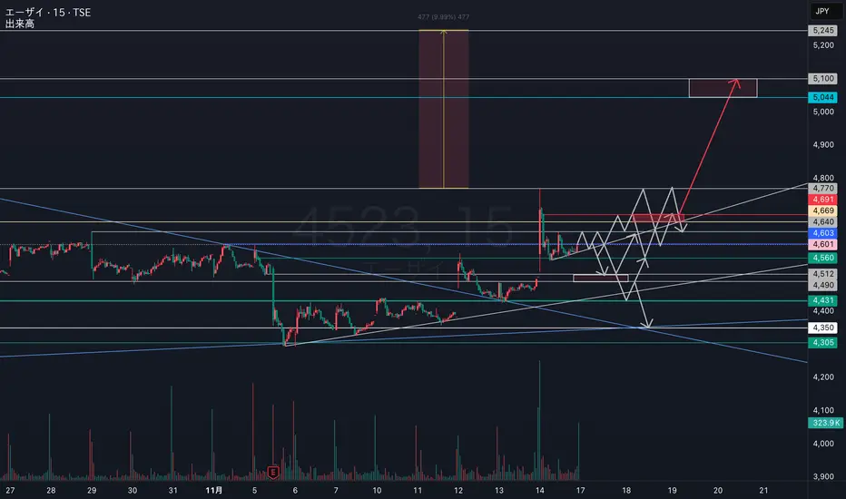 4603円がキモ。ここを抜け4640円がレジサポ転換すると上に伸びやすいイメージだが逆にレジスタンスになり4560円がサポートされない場合、もう一度白のBOXを試しに行く展開を予想。