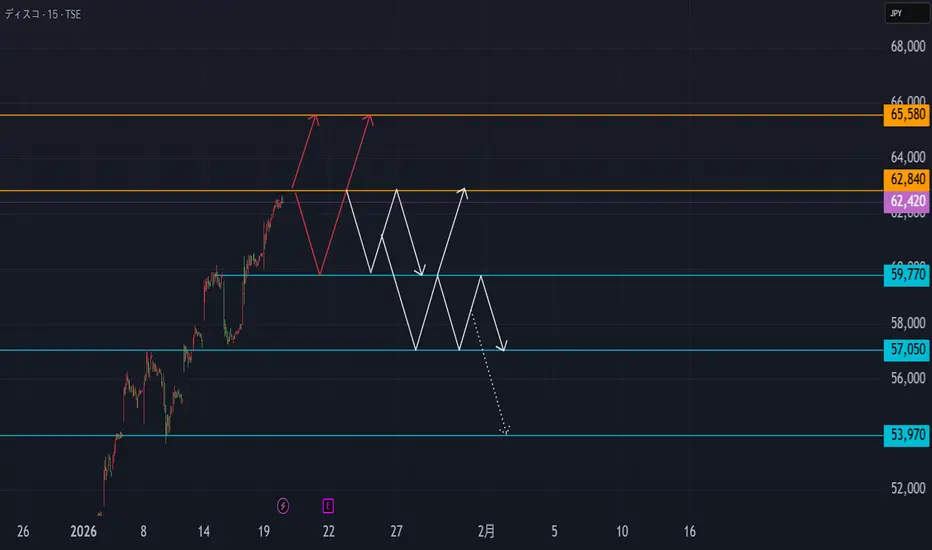 15分足分析 59770を割らない限り上目線 当初ターゲット62840到達後の押し目を狙いたい