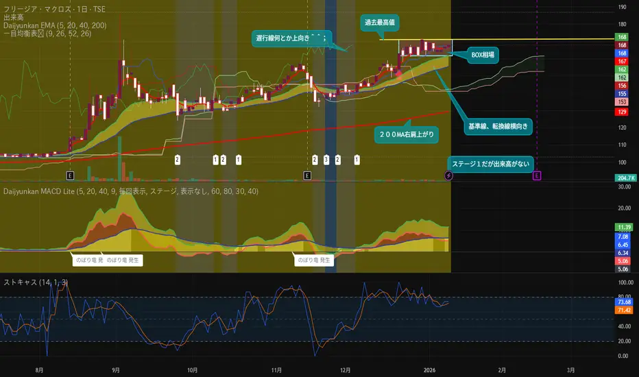 赤い矢印の出来高を伴った陽線でインしてみたが翌日からヨコヨコスタートでBOXの箱入り娘^^;今の所大循環EMA短中長MA右肩上がりなのですが今後BOXから出来高を伴った陽線で上抜けなかったらOUTPUT^^;さようならです!さて、後日以降どうなりますかね?