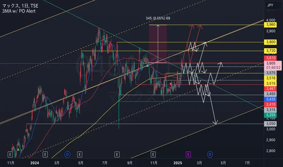 鬼門の3610円がサポートされればターゲット3960円に向かって上昇していけると予想。