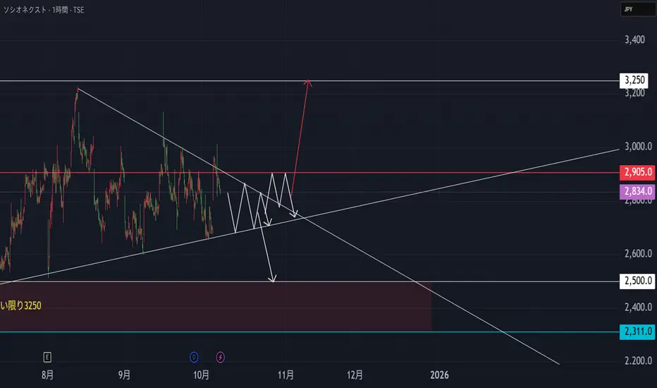 1時間足 2905を試して超えられなかったのでトレンドラインまで落ちる 右肩下がりのトレンドラインが追い付いてくるのでこれを抜ければ上がってくる