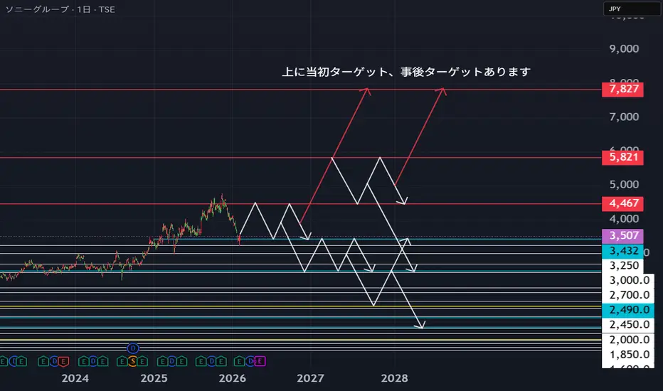 日足分析 4467~3432のレンジ 下抜けで3432~2490のレンジ 上抜けしたら5821を目指す