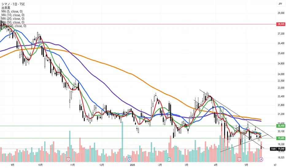ついに4月24日の下値19320を割ってきた。20000円が岩盤だったが、しっかり割ってきた。このラインをずっとキープして反発、維持してきたが、ここは決着がついたと考える。
