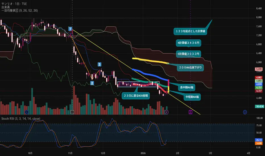 今回一目均衡表の計算値で123を起点としてもっと下がったとしたら?で計算値を出してみました。POPのとうりです。まぁ業績がいいからこんなに下がる事は無いと思いますが一応出してみました。一目均衡表の抵抗帯の雲の下で200MA右肩下がり、出来高はそこそこですが23日続いたBOX相場からの下降はキツイ!金曜日の陽線による上昇が救いか?!