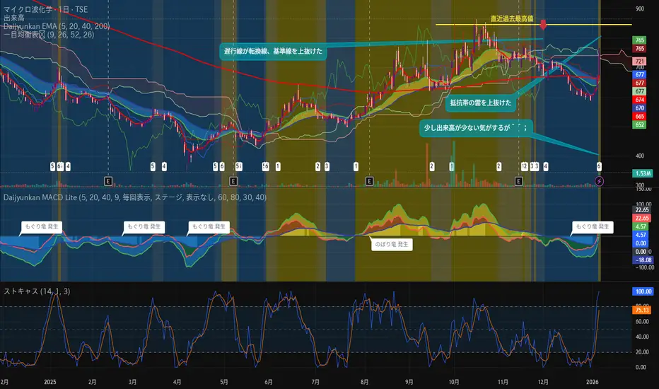 今後どうなるのか観察。後日更なる陽線で上昇し、中期MAが長期MAの上に行き各MAが上から短中長になるとステージ1となります。^^v