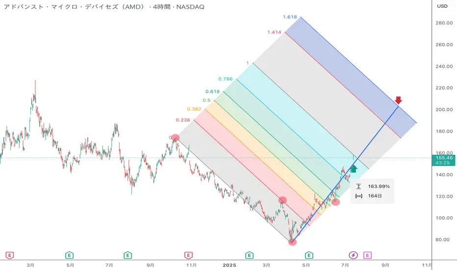 フィボナッチ・チャネルを赤丸の4点でフィッティングする。