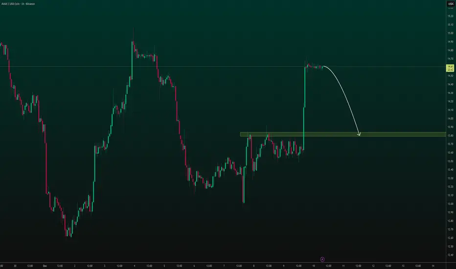 AVAX just saw a sharp spike to a new high, but is now showing signs of a potential pullback. The white arrow indicates a possible retracement towards the highlighted support zone.