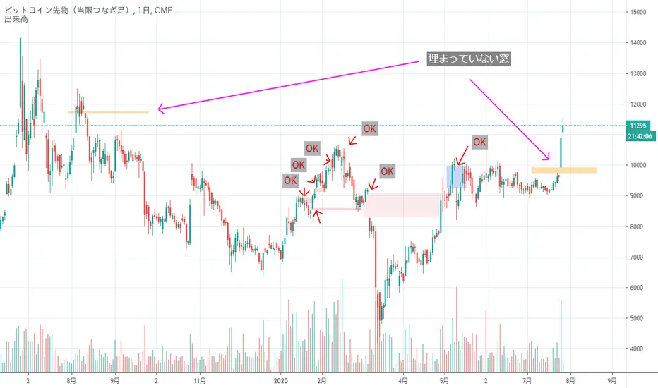 過去しっかりと窓埋めをしているCMEのビットコイン先物、下の窓に目を向けている方が多かった印象だが、先に上の窓を埋めにいくのかという動きを見せる