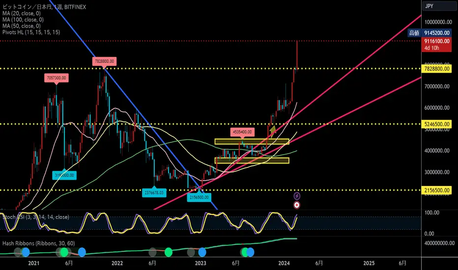 2021年の史上最高値をなんなく更新してからは強さ止まらず!900万円台に軽く乗せてきたビットコイン★700万・600万がサポートになりそうな感じである。サイクル理論やETFの件など過熱してると思っていたがボラティリティの高さに驚かされる。もはや売る理由は今は見つからない。