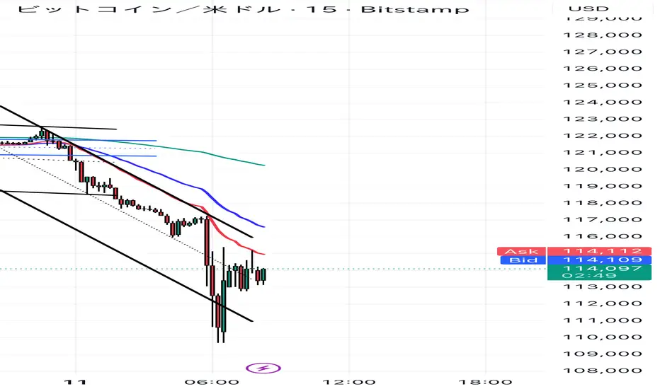 昨日はブルーのチャネルを下抜け下落。さらにその後も下落を続け、急角度のブラックチャネルも下抜ける状況。