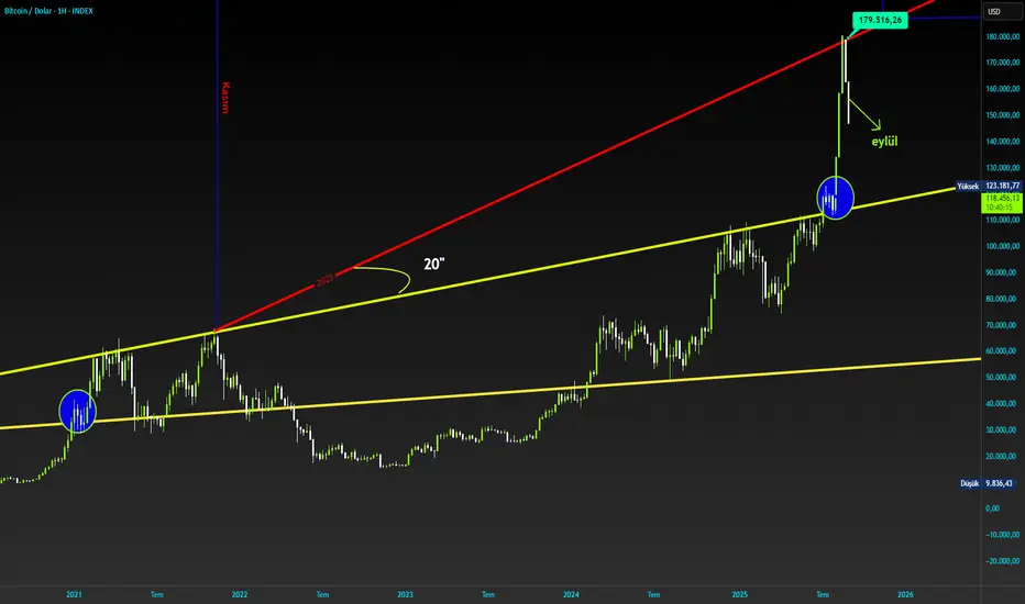 Şimdi ise bu aynı görünümün gerçekleşmesi için tespit edilen haftalık kapanış değeri 119100 dolar. Günlükte 125 bin doların önemini unutmadan, 119100 dolar üzerine haftalık kapanışla 3 hafta içinde 180 bin dolar olma ihtimalimiz oluyor. Zaten ATH tepelerini geçtiği için bu trend altına sarkma durumu olmadığı sürece yön hep o seviyeler olacak.