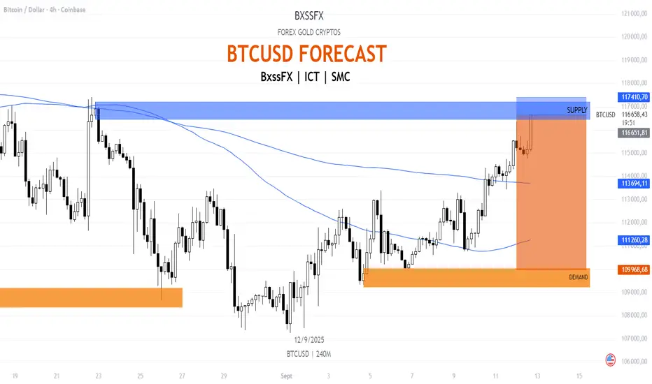 Le BTC arrive dans une zone de supply 4H autour de 116 500 – 117 400 $, déjà testée par le passé.