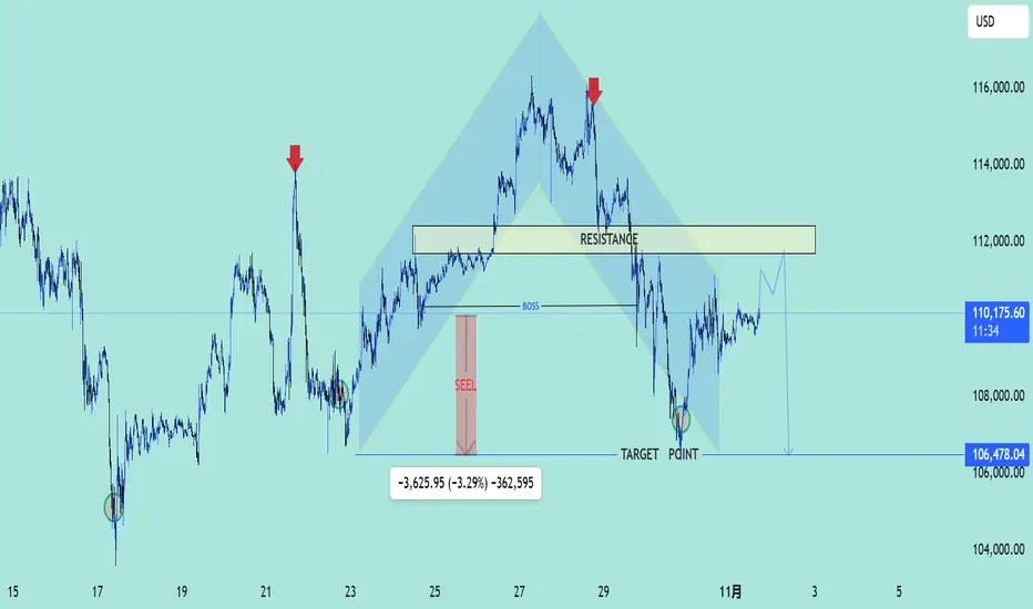 価格がレジスタンスに到達した後、下降方向への反転 が予測され、ターゲットポイント はおよそ 106,478 USD です。