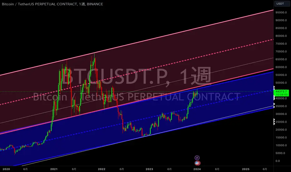 ビットコインのパラレルチャネル、青はショックレンジの底、ピンクは強気市場の急騰領域です。
