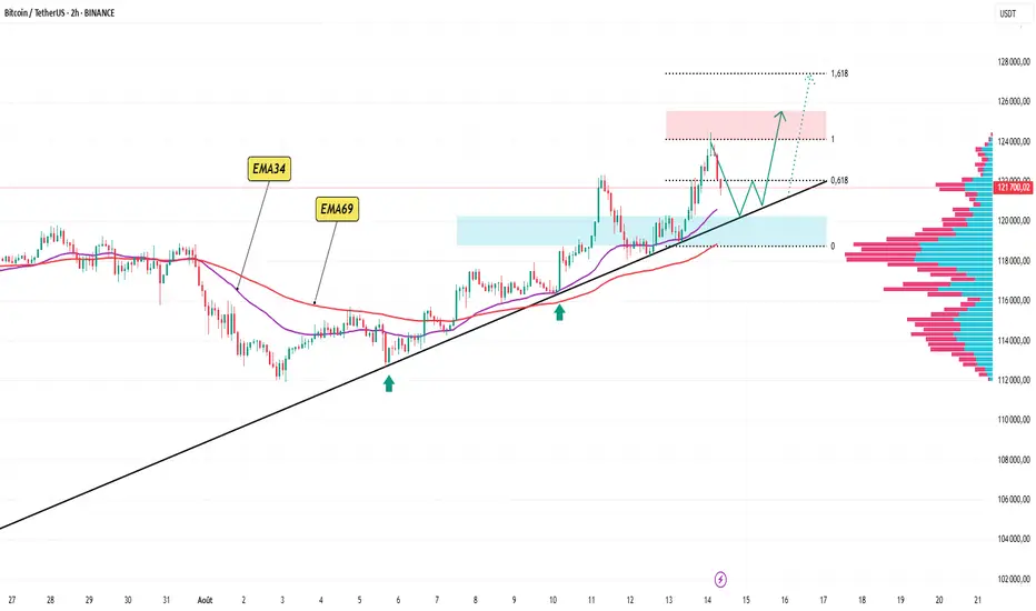 Le Bitcoin maintient une structure haussière avec un prix au-dessus de la trendline et des EMA, tandis que les corrections récentes se sont arrêtées sur la zone de support dynamique. Le volume des échanges est fortement concentré autour de 118 000–120 000 USDT, zone de consolidation clé dont la rupture pourrait ouvrir la voie vers la résistance à 124 000 et l’objectif Fibonacci 1,618 autour de 127 800–128 000 USDT.