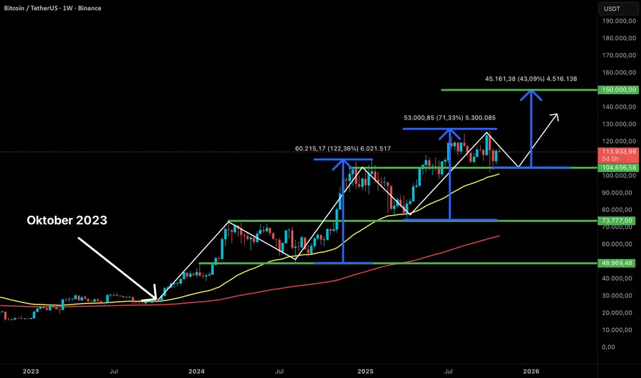 Würde sich dieses Muster fortsetzen, wäre ein Anstieg von rund 40 % bis in den Bereich um 150 000 USD in diesem Zyklus absolut realistisch.