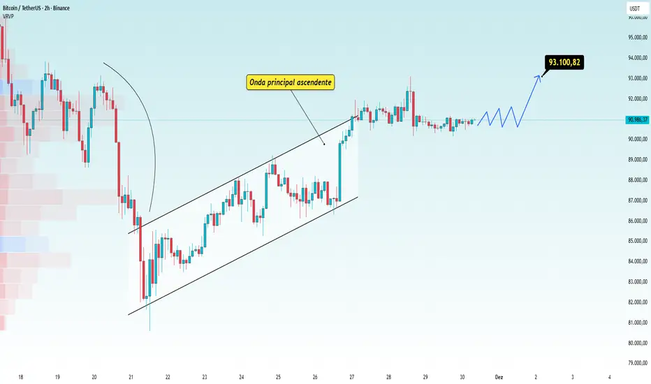 Cenário preferencial: O BTC mantém-se na zona dos 90,5k - 90,9k e retoma a tendência de alta para os 93,1k.