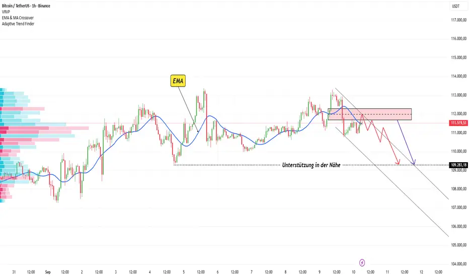 Kurzfristig könnte BTC, falls der Kurs die rote Widerstandszone nicht überwinden kann, weiter bis zur wichtigen Unterstützung bei 109.300 fallen. Ein deutlicher Durchbruch unter dieses Niveau würde einen stärkeren Rückgang auf 108.000 – 106.000 auslösen.