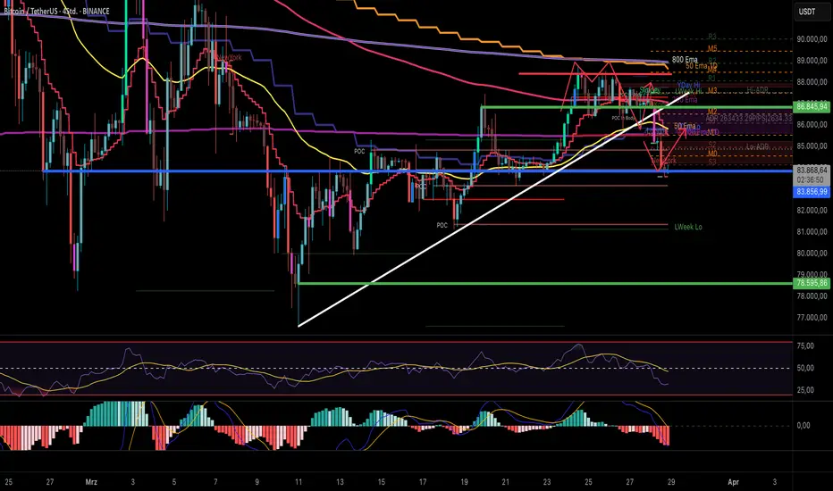 Sollte die blaue Linie nicht halten, könnte Bitcoin über das Wochenende hinweg weiter nachgeben und die grüne Support-Linie erneut testen.