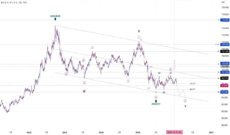 現在そのY波のⓒ波として下落継続としています。これにより、これまで投稿しているメジャーなドルストレートのペアも変更しています。特にユーロドル、ポンドドル、ドルスイスなど直近の投稿は変更済みです。