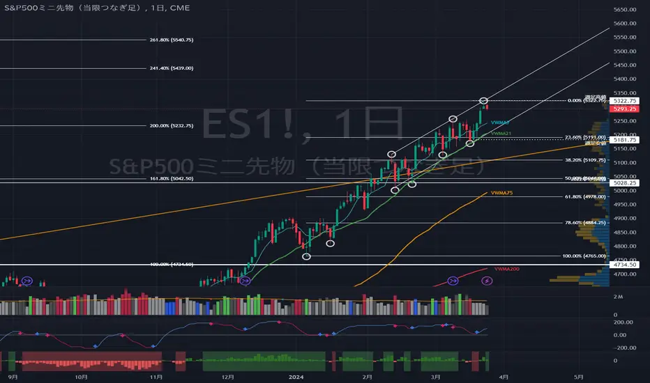 21日出来高移動平均線を下抜けて今週安値を下回る場合は、軽い調整なら平行チャネルの上ライン(オレンジ線)やフィボナッチ38.2% 5,109.75前後での値止まりがあるかが確認したい。