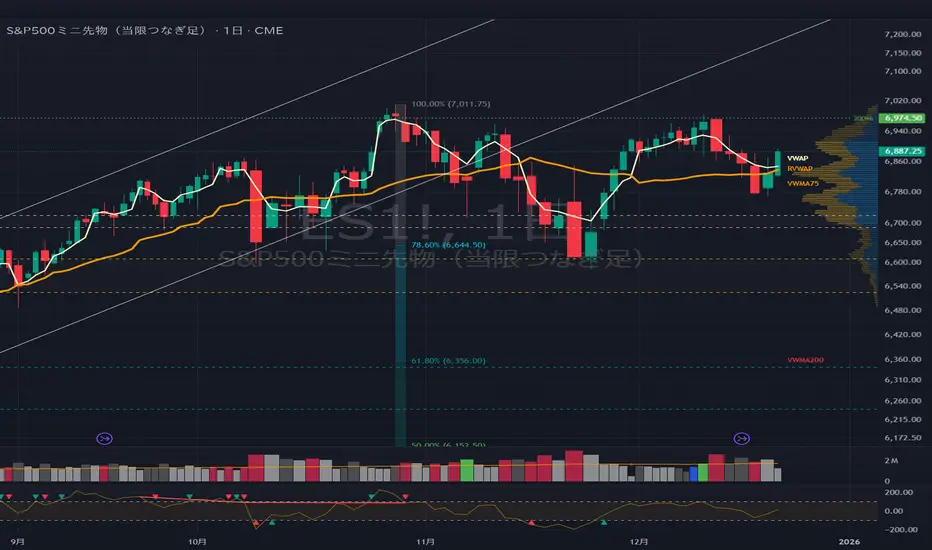 FOMC後の急落は出来高を伴っており、12月17日(火)まで連続した陰線を形成。75日出来高加重移動平均線をやや下回ったところまで下落したが、そこから反発し週末にかけて持ち直した。現在価格は約6,687レベルで、VWMA75、RVWAPのやや上で推移した。
