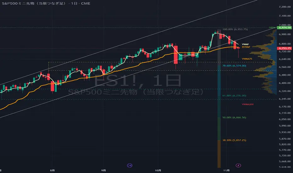今週は11月5日(水)から11月6日(木)まではRVWAPの少し下で耐えていたが、11月7日(金)にはRVWAPを下抜けて下落を試した。下落は75日出来高加重移動平均線の手前まで続いたが、そこで止まりリバウンドしている。長めの下ヒゲが強い反発を示唆する。政府閉鎖中だが両党が政府再開に向けて交渉している事実から、市場が閉鎖終了期待で一定株価を戻した動きのようだ。