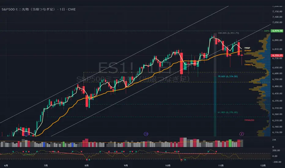 結果としては、最高値の6,953.75まで戻せず登り途中で失速し、300%ラインの6,974.5を目指せなかった。一方で今週の高値から後半下落したが、75日出来高加重移動平均線でサポートされ、わずかに安値を切り上げリバウンドした。先週11月7日(金)と同じ動きをしている。今週の安値はボリンジャーバンド(チャート外・私の特殊設定)で-2σを下抜けてたのでごく短期的には下がりすぎの水準とも示唆されていた。