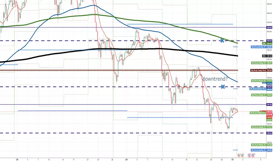 週末にダブルゼロ400.00付近で押し戻されましたが再度水平線(私のチャートで461.80)に止められました。