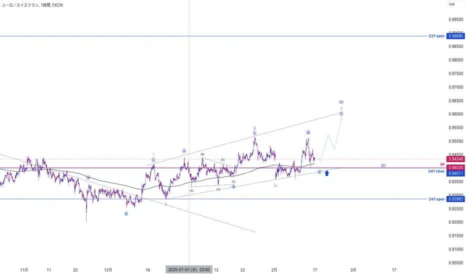 0.94のSRの上の展開では、積極的にロングを狙いたいところですが、週明けは現在価格からそのまま上昇するか、一度0.94もしくはその下のダイアゴナルライン付近へ若干下落してからの上昇を予測してます。