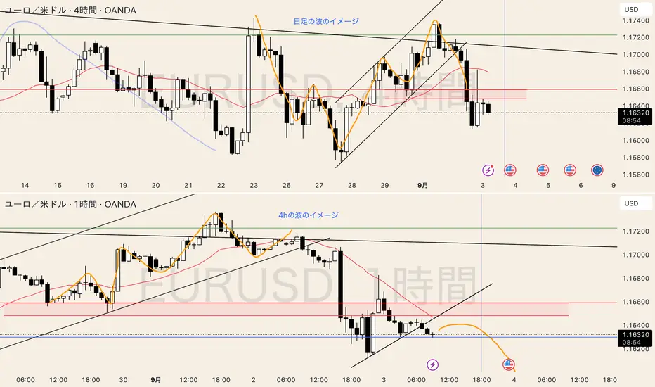 4h安値を割り方向は下、勢いは追随期となる為、あとひと波残っている。