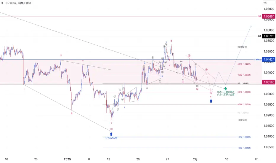 先週の予測に沿った形で調整をしていますが、この調整の部分はフラットabcとして下落しているとみてますが、そうである場合、フラットcはダイアゴナル形成と思いますが、もう一つ下落波ダイアゴナル⑤波が残されているように見えます。