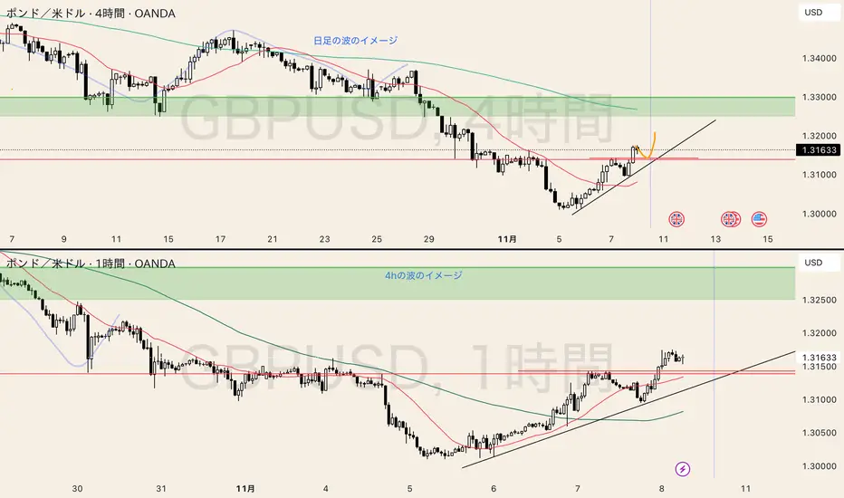4h7波になる可能性があるが、日足戻り売りエリアまで値幅があるのと、4h節目まで押しを付ければ、トレンドラインにに到達し巡航性も良いため、日足節目まで狙って行きたい。