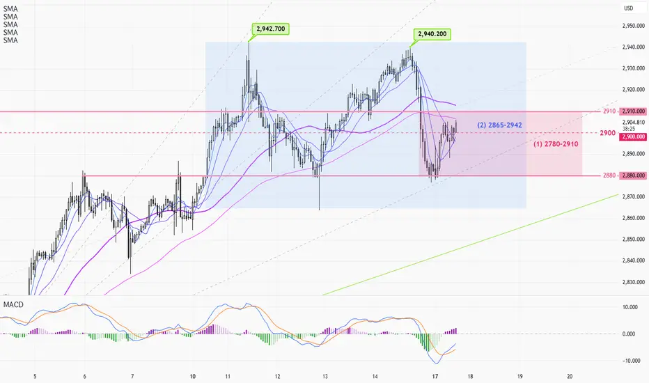 1時間足チャート(上) > 月曜日は米国の祝日なので、価格は2780~2910の範囲内に収まるはずです(1)。今週後半には、2865 年から 2942 年の間でより幅広いレンジが予想され、次の主要トレンドラウンドの前にブレイクアウトを待ちます。