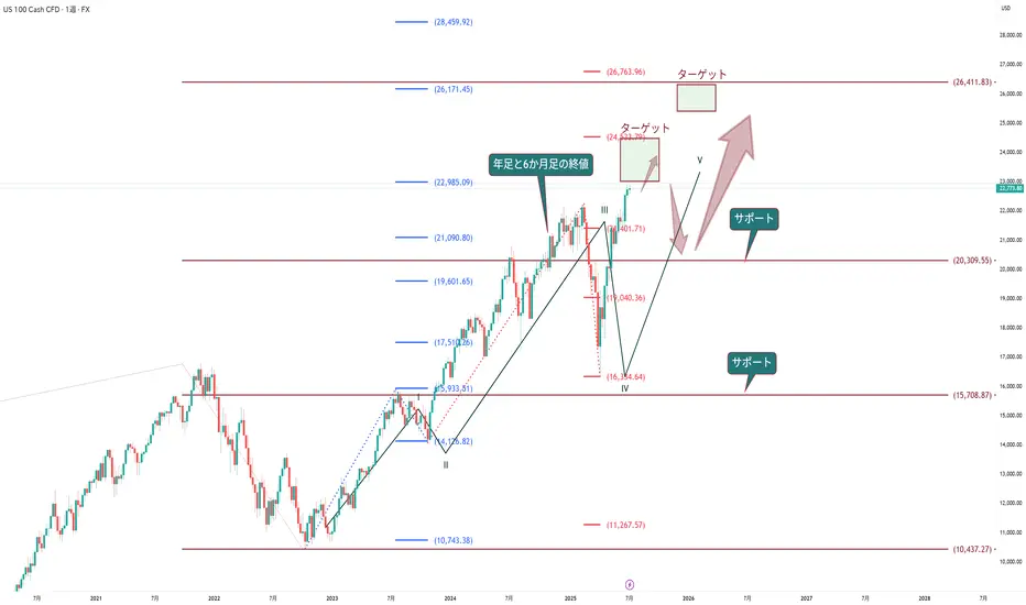 今が5波なので、次の目標値が23000か26000かのどちらかとなります。