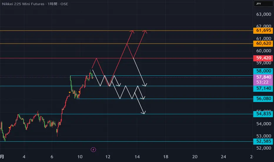 1時間足分析 5800割れたら57140までのレンジ相場